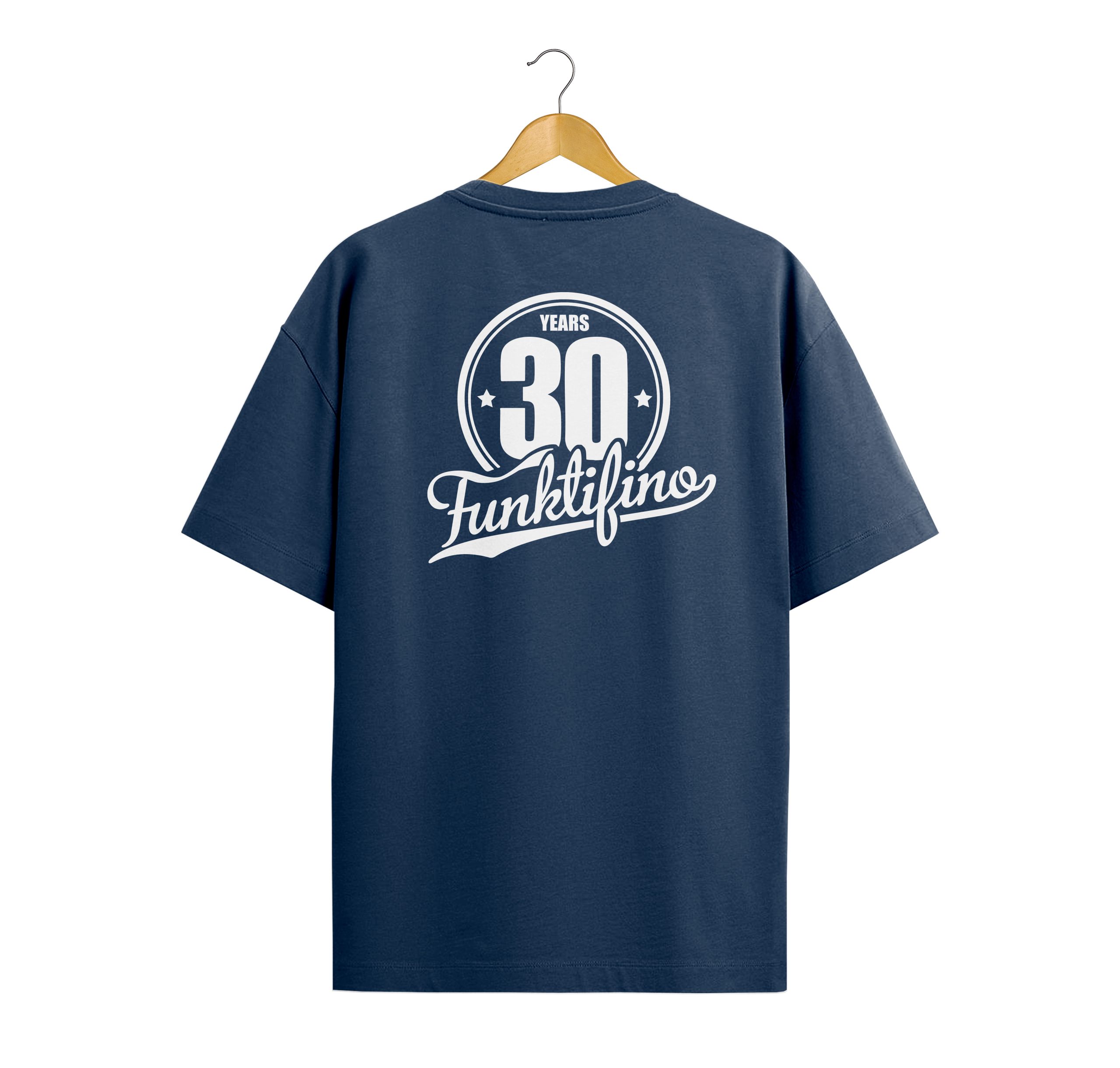 Funktifino 30 Years T-shirt in navy blue with small white logo on front, large on back
